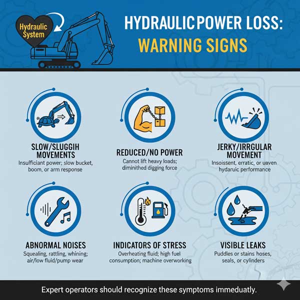 Hydraulic power loss manifests through clear symptoms that expert operators should recognize immediately: